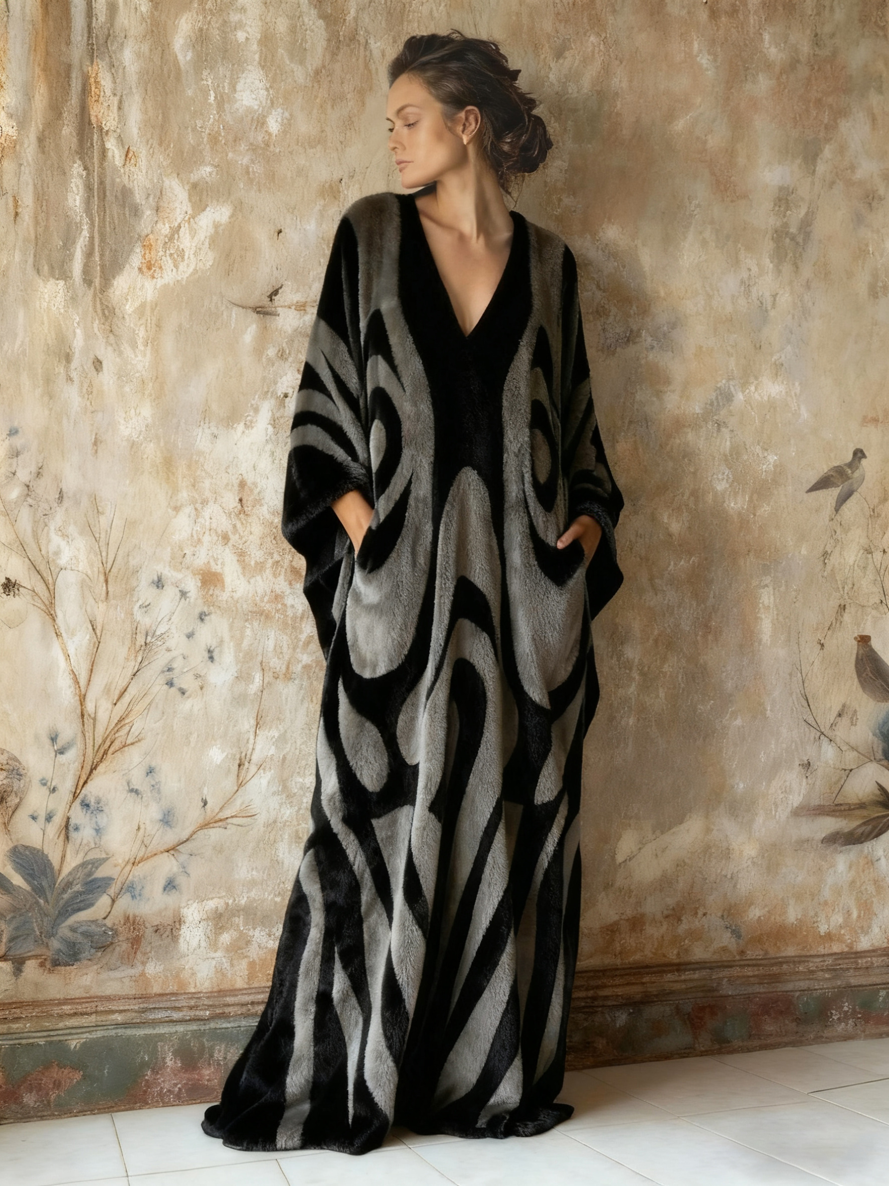 Fabric: Made from a faux fur - like fabric with a bold black - and - gray print, this kaftan offers exceptional softness and warmth. The fabric is cozy and provides a luxurious feel.