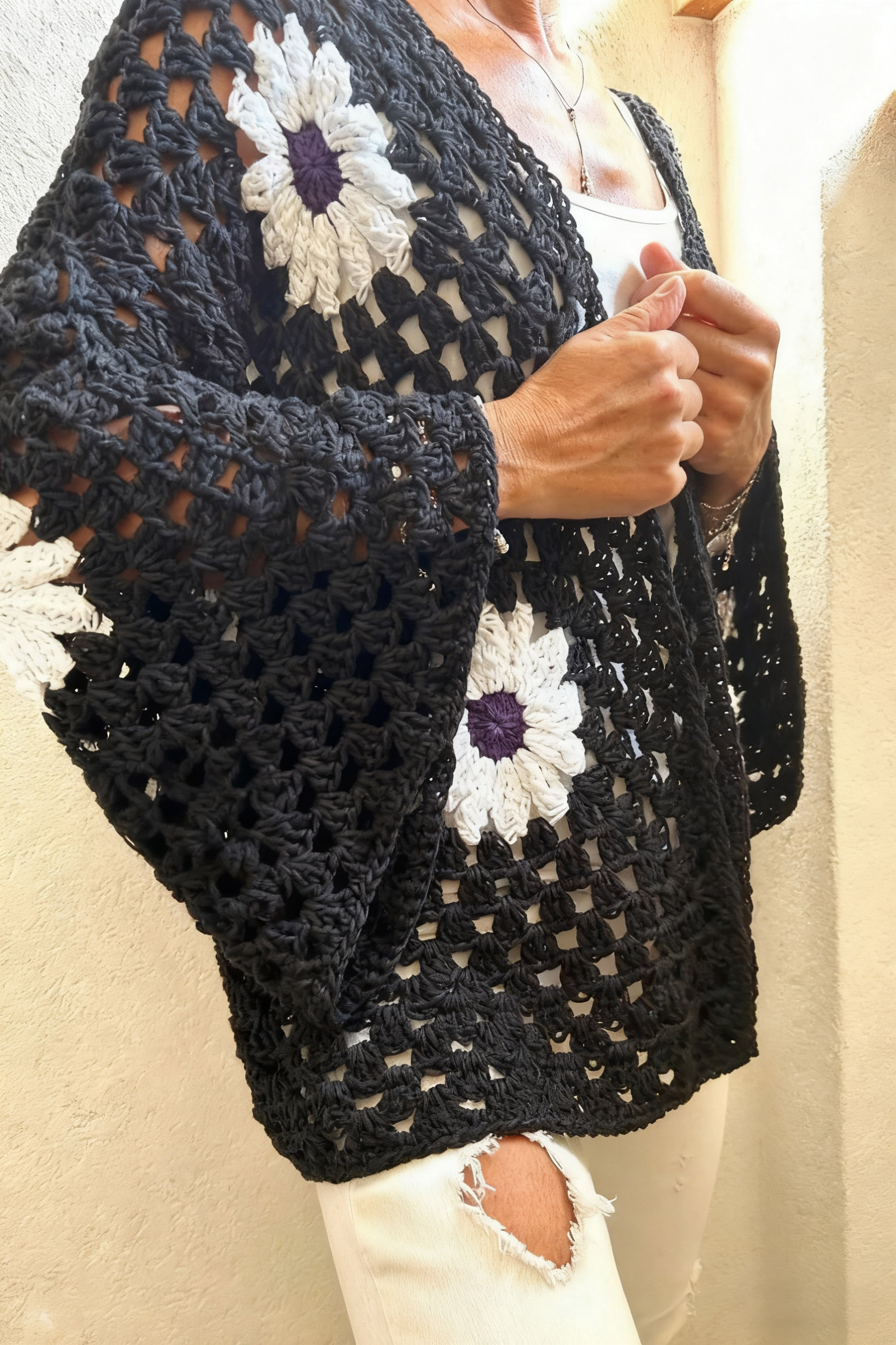 Classic Black and White Chrysanthemum Pattern Knit Cardigan