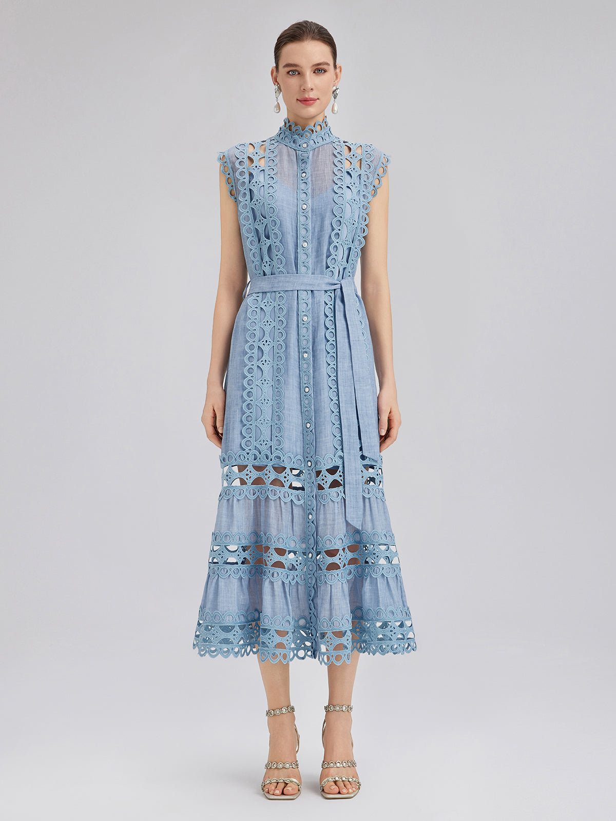 Crafted from soft, lightweight Tencel-ramie blend with excellent breathability and drape. Features sheer cutout trims panels that subtly reveal a feminine, sensual touch. Pleated skirt with enhanced volume for graceful movement. Finished with a single row of pearl buttons for refined detail. Relaxed A-line silhouette.