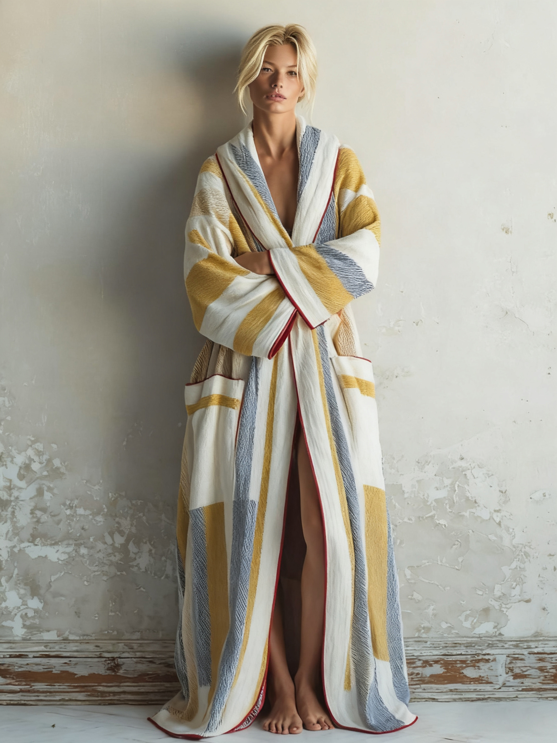 Fabric: Crafted from a plush, striped fabric, this robe offers exceptional softness and warmth. The fabric provides a cozy, gentle touch against the skin, ensuring comfort whether you're lounging at home or stepping out briefly.