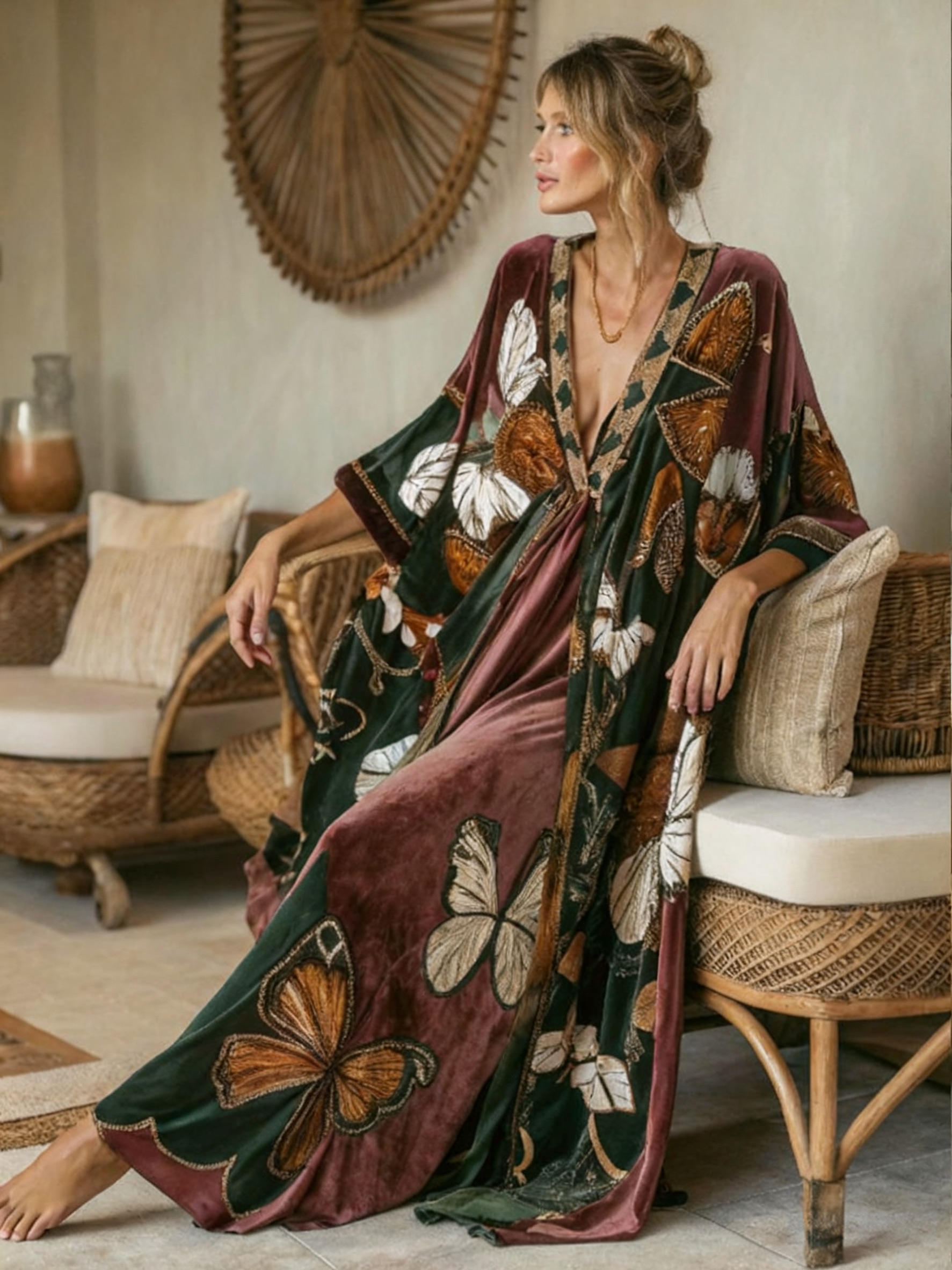 • Fabric: Crafted from a luxurious velvet fabric with a butterfly print, this kaftan dress offers a rich texture and a sophisticated look. The fabric is soft and has a slight sheen, adding to its elegance.