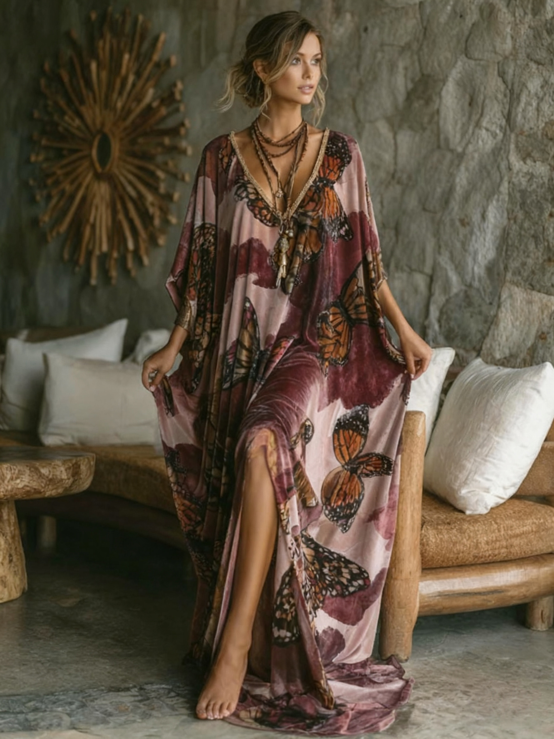 • Fabric: Crafted from a luxurious velvet fabric with a butterfly print, this kaftan dress offers a rich texture and a sophisticated look. The fabric is soft and has a slight sheen, adding to its elegance.