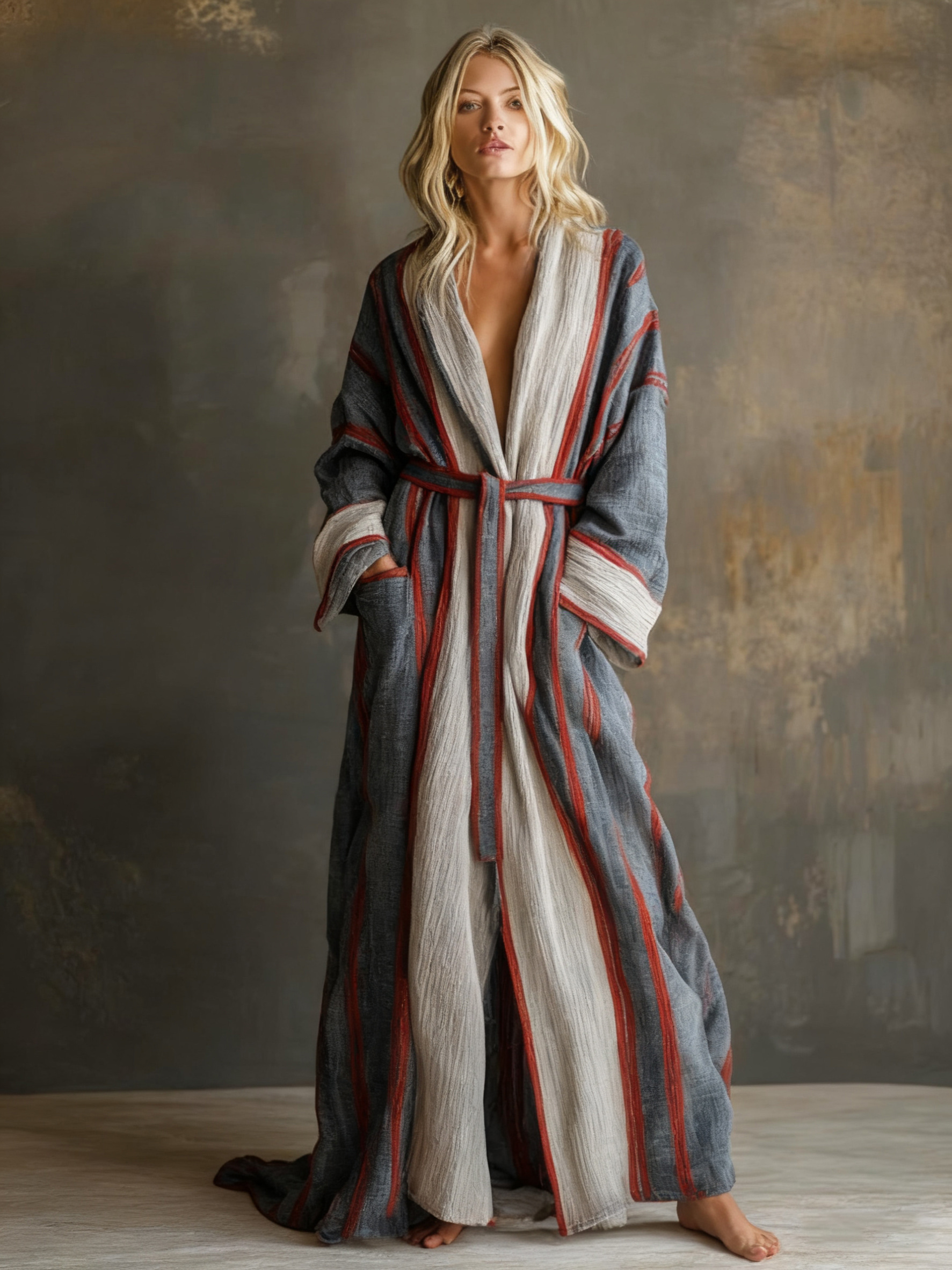 Crafted from a premium cotton - linen blend, this robe offers exceptional softness and breathability. The fabric provides a lightweight, airy feel while still having a gentle structure, ensuring cozy comfort and ease of movement whether you're lounging at home or stepping out briefly.